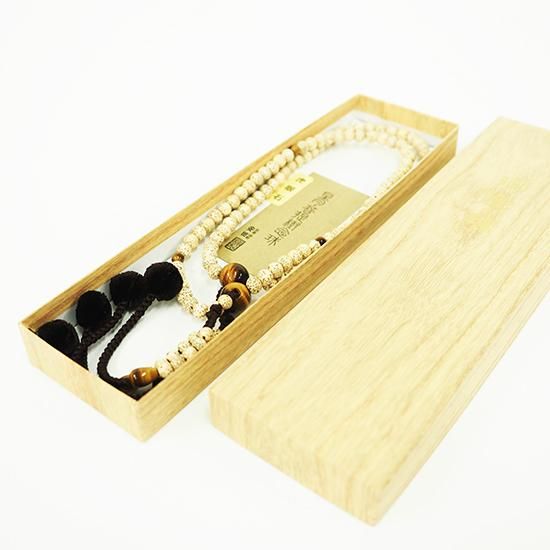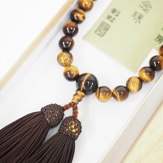 15,400円(内税)古くからお念珠の材として親しまれている菩提樹と独特な縞模様と艶やかな輝きのバランスが絶妙な美しい天然石の虎目石で仕立てられた真言宗本式念珠です。