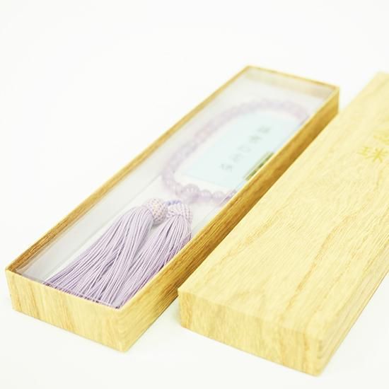 12,320円(内税)紫水晶(アメジスト)の中でも紫色が薄く、灰白色の雲を描いたような模様が入っている籐雲石を使用した略式片手念珠です。